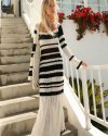 Women Fashion Black White Stripe Hollow U Neck Knitted Long Sleeve Maxi Dress